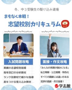 冬期講習会/学志館の話 中学2年生、増えています。 2025年12月19日 いよいよ冬期講習会スタートです。 個別指導なら途中参加もお気軽にご相談ください。 積み残しの学習を 新年、新学年へ向けた学びを。 冬だからできる。 知識と意識の指導。 中学2年生、受験学年へ 増えています。 私立高校事情も大きく変わる中、 的確な情報と合格のための指導をご提供します。 冬のトライアルコースもまもなくおしらせします。