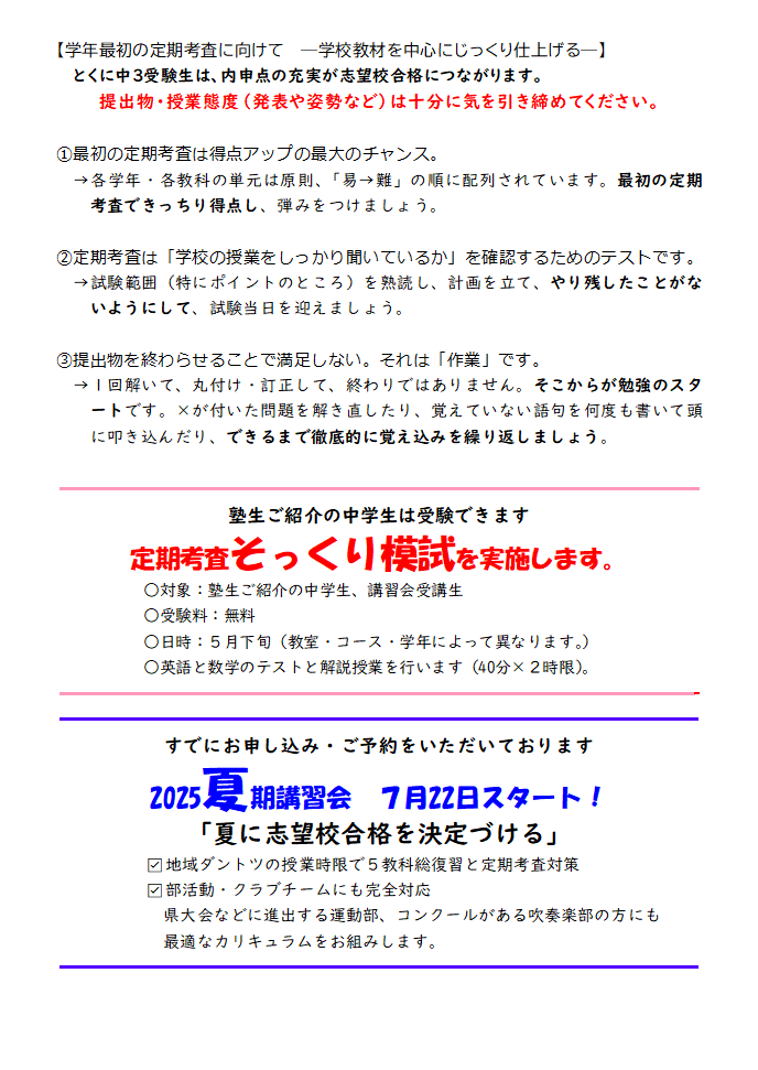 今日の一言/福間塾長 とりあえずやってみる。 2025年5月12日 はじめてもいないのに きめつけるのはやめよう。 ちょっとやってうまくいかないからといって やめてしまうのはやめよう。 はじめの一歩をふみだす。 いったんながれに乗ってみる。 ちがっていたら軌道修正すればいい。 意味や理由は後付け。 結果も後でついてくる。 回顧して初めて気づくこともある。 むしろそのほうが多いかもしれない。 「あのときのあれが 今のこれにつながっている」 そう思える時が必ず来る。 やろう。 続けよう。 毎日が始め時。