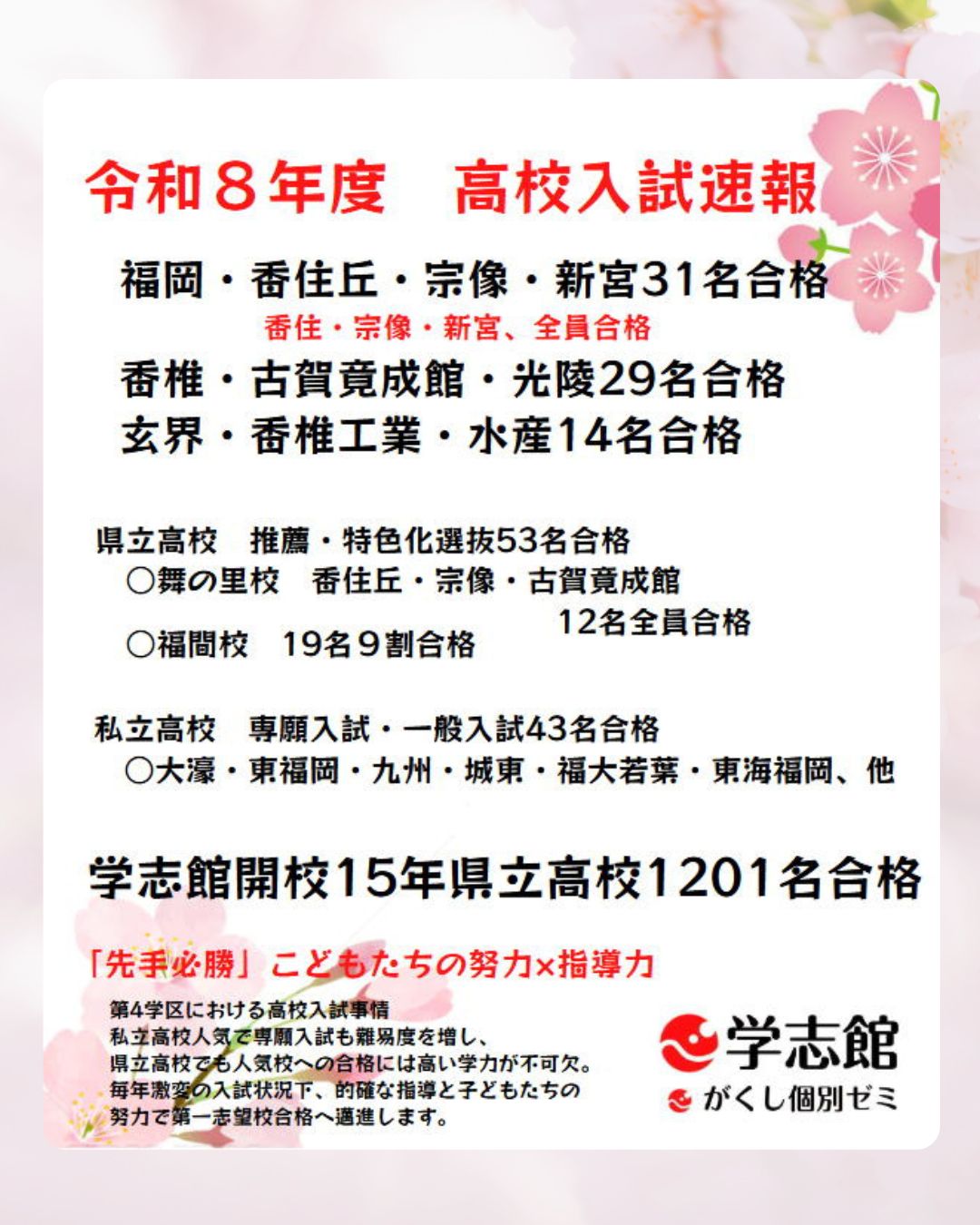 学志館の話 令和8年度 高校入試結果 2026年3月21日 『先手必勝』 第一志望校合格へ 学力が絶対条件。 学志館では効率よく学ばせ、 正確な入試情報と的確な指導で子どもたちを導きます。 志望校合格のために「先手必勝」 春講まもなくスタートです。